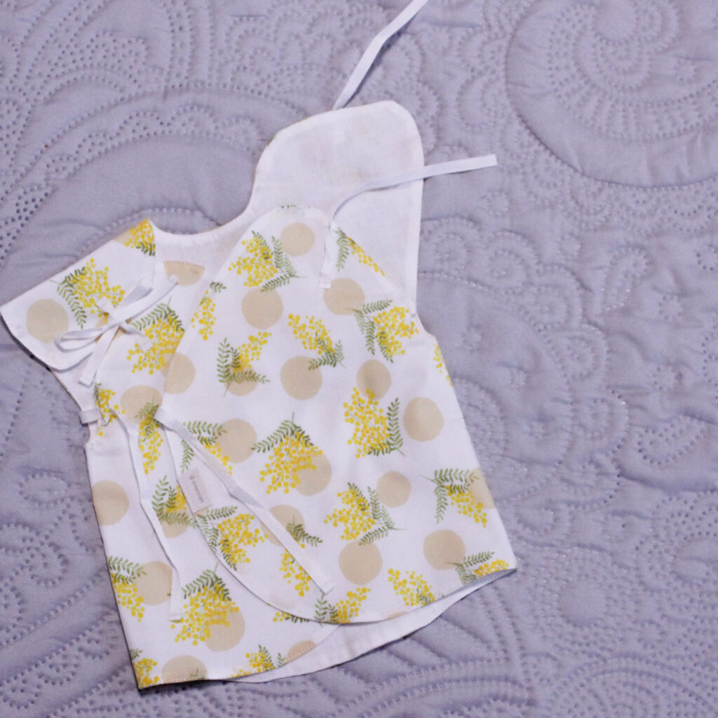 前の合わせだけでなく肩の部分も紐で結ぶデザインになっています。 脇が深めに空いたフレンチスリーブなので、モニターやルートをつけたままでもお着替えができます。 左右の紐を脇のループに通していただくことで、ズレを抑えます。 内側はダブルガーゼ、外側は極薄のローン生地の二枚合わせでお仕立てしていますので、伸縮性のない生地ではありますが柔らかい肌あたりになっています。